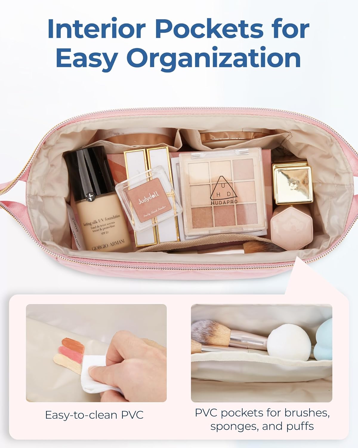• 【Easy-clean Pocket】- This well-crafted make up bag features easy-clean pockets with PVC lining to hold your makeup brushes, powder puffs, and other travel accessories. Travel cosmetic bags for women ensure that your skin care and beauty products remain protected and spill-proof. Perfect for women who are always on the go.
