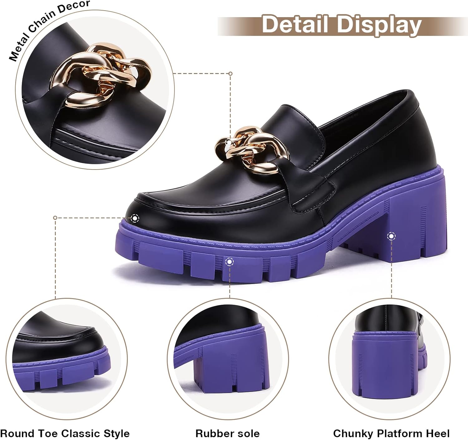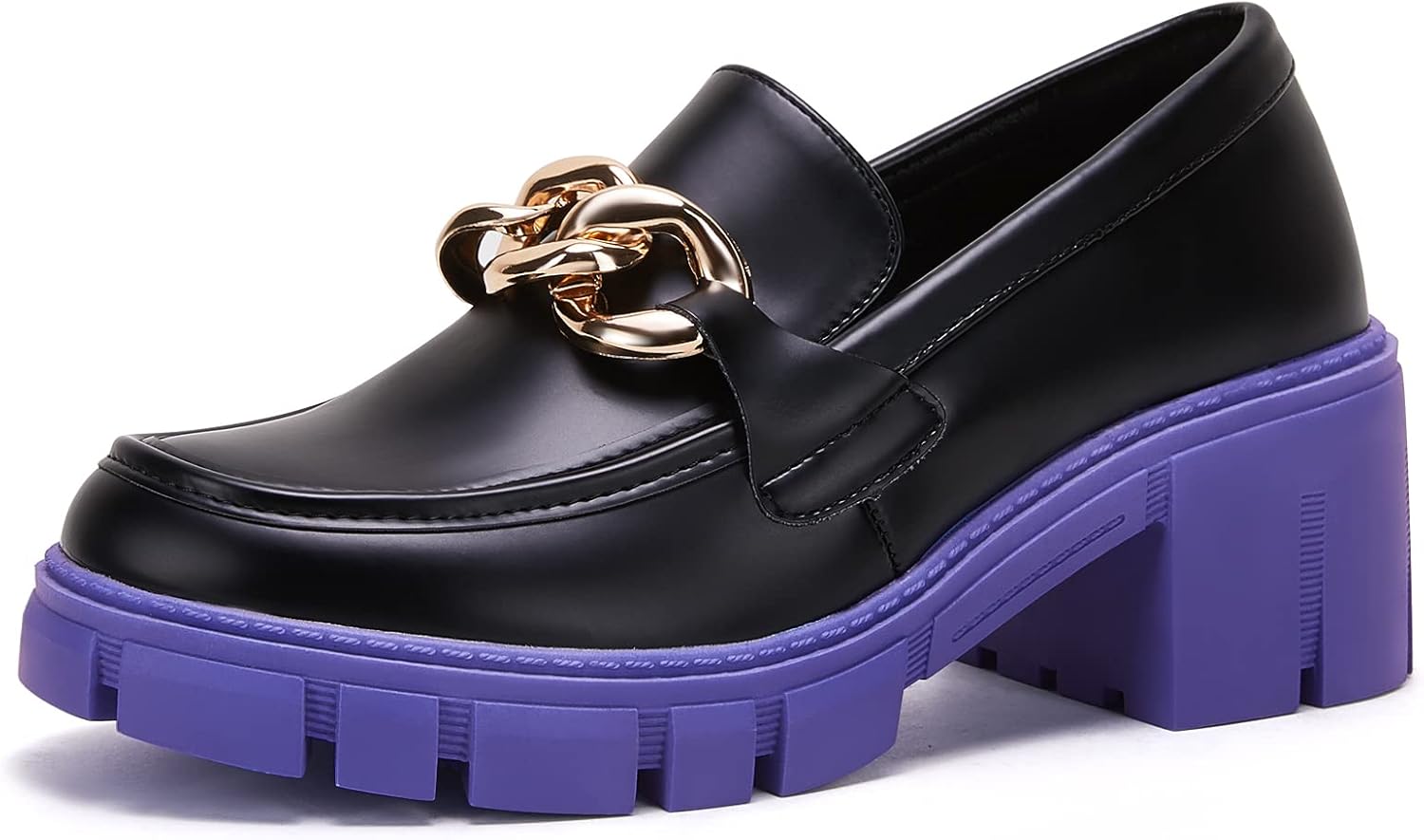 • Chain Loafers: Chunky platform low block heel combine with PU leather upper,this chain loafers inspire from classic design,also add Big Chain element fashion design element to this slip on loafer.