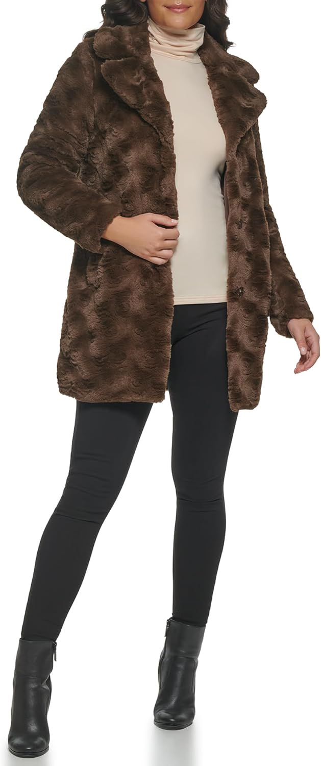 • Features: notch collar faux fur button front wubby, textured faux fur