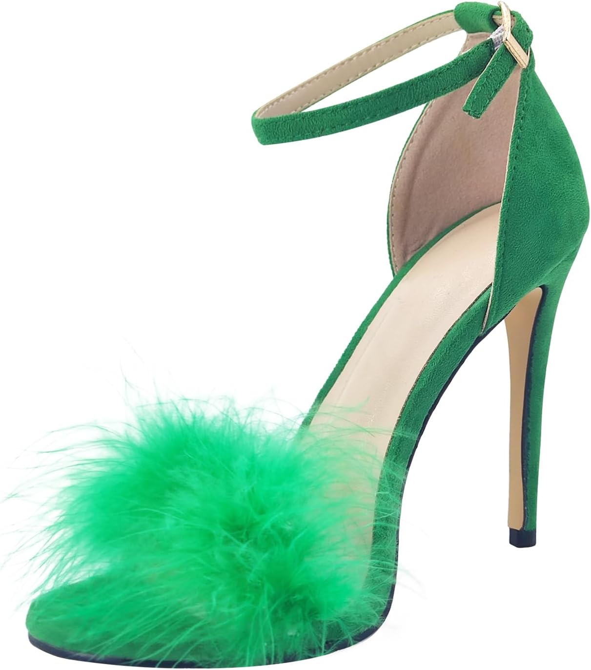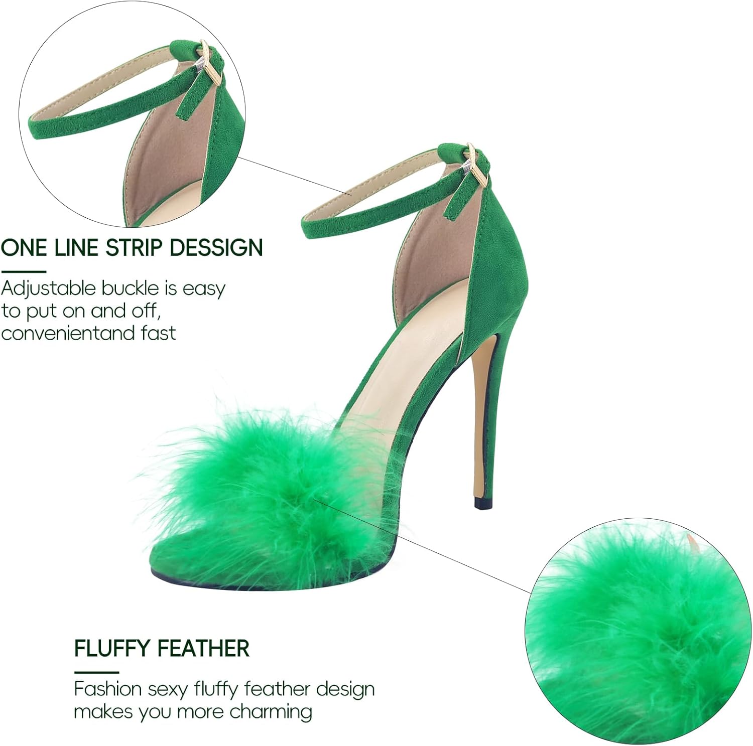 Women’s Feather Heels Open Toe Sandal Fluffy Fur High Heel Shoes Ankle Strap Stiletto Pump for Wedding Party Dance Evening