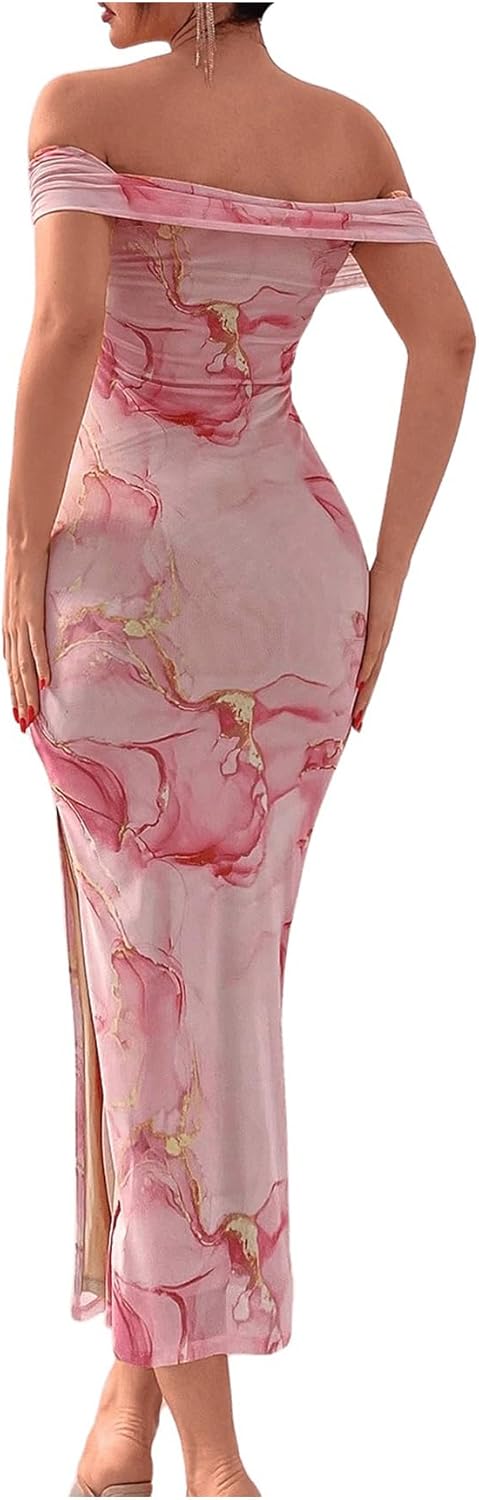 Women’s Floral Print Off Shoulder Short Ruched Bodycon Long Dress