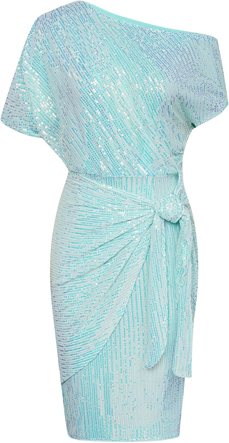 - 【FEATURES】Short sve party dress, sparkling sequins, asymmetric one shouler, 6)Front skirt with overlay decorated, hidden zipper in right side, hits above knee, slim fit hips-wrapped silhouette, sexy bodycon party midi dress for women.