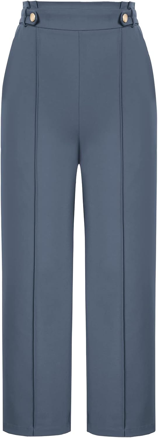 Women’s Straight Leg Cropped Work Pants Elastic High Waist Wide Leg Business Casual Slacks with Pocket