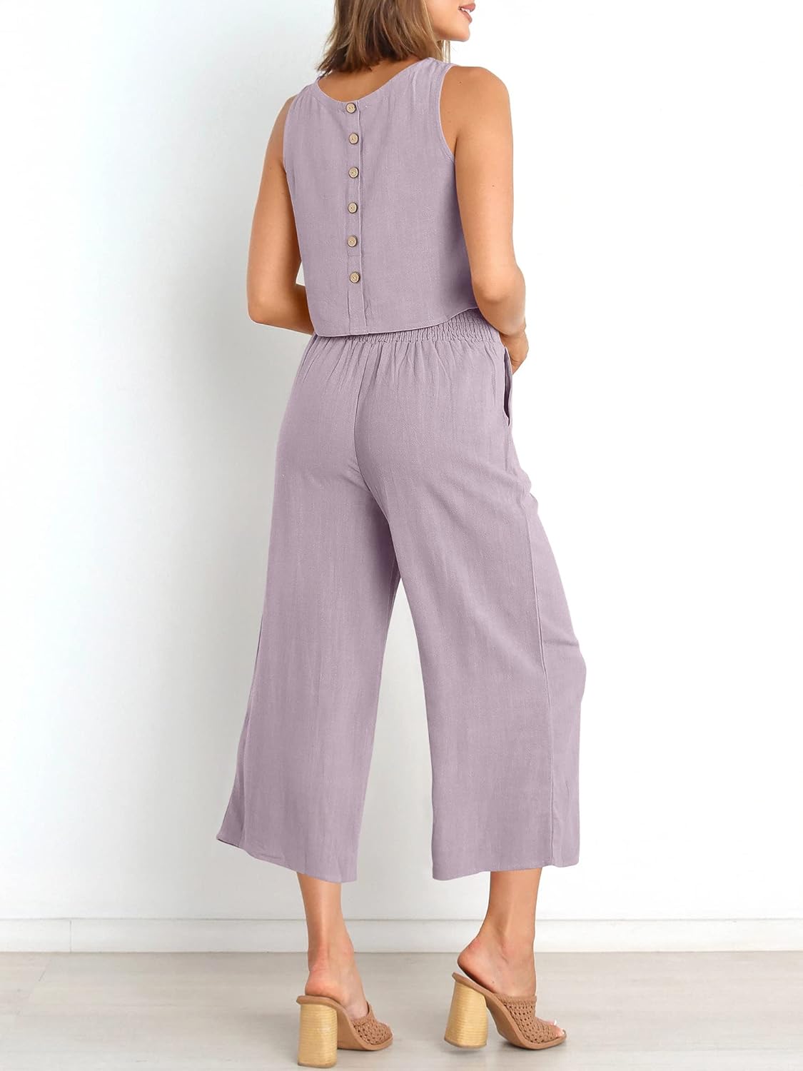 • Features – This 2 piece outfit features a sveless round neck crop top, wide-leg cropped pants, button back, high waist, and a wide waistband for added comfort.