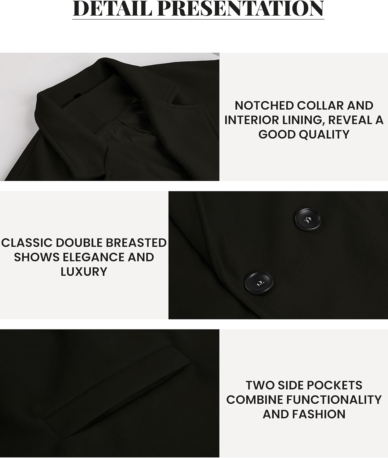 • Versatile: Style these wrap coats for women with tights, heeled boots and a basic top or a turtleneck for a chic and slouchy combo. Black wool coat is perfect for everyday, dating and work. The thick coat gives you the freedom and courage to go out in chilly weather